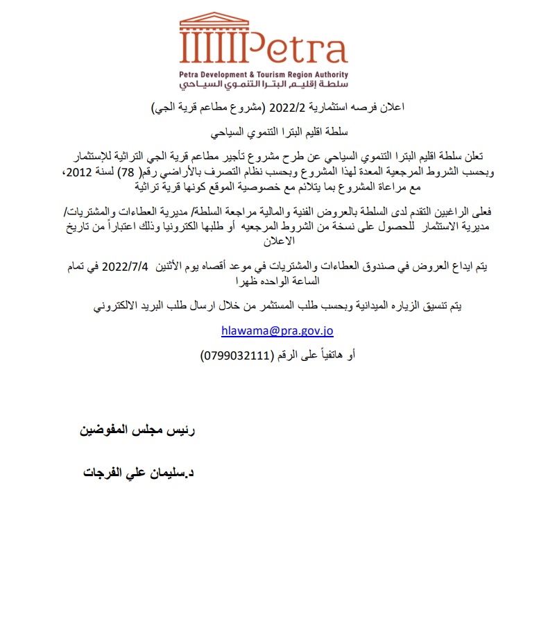 اﻋﻼن فرصة اﺳﺗﺛﻣﺎرﯾﺔ 02/2022 (مشروع مطاعم قرية الجي)