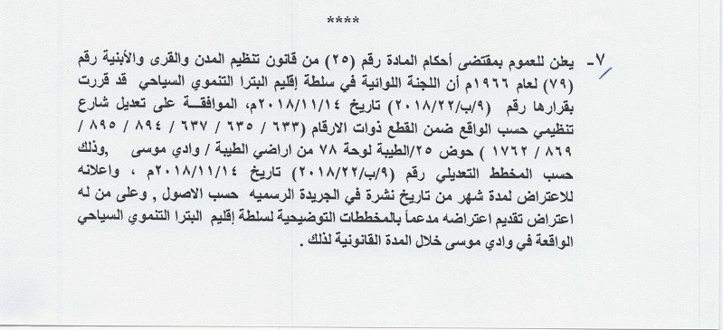 اعلان موضع تنفيذ الموافقة على تعديل شارع تنظيمي حوض 25/ الطيبة لوحة 78 من اراضي الطيبة
