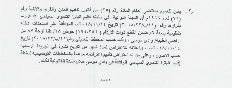 اعلان الموافقة على دخلة تنظيمية بسعة 6 م حوض 28/ طنا لوحة 78 من اراضي الطيبة
