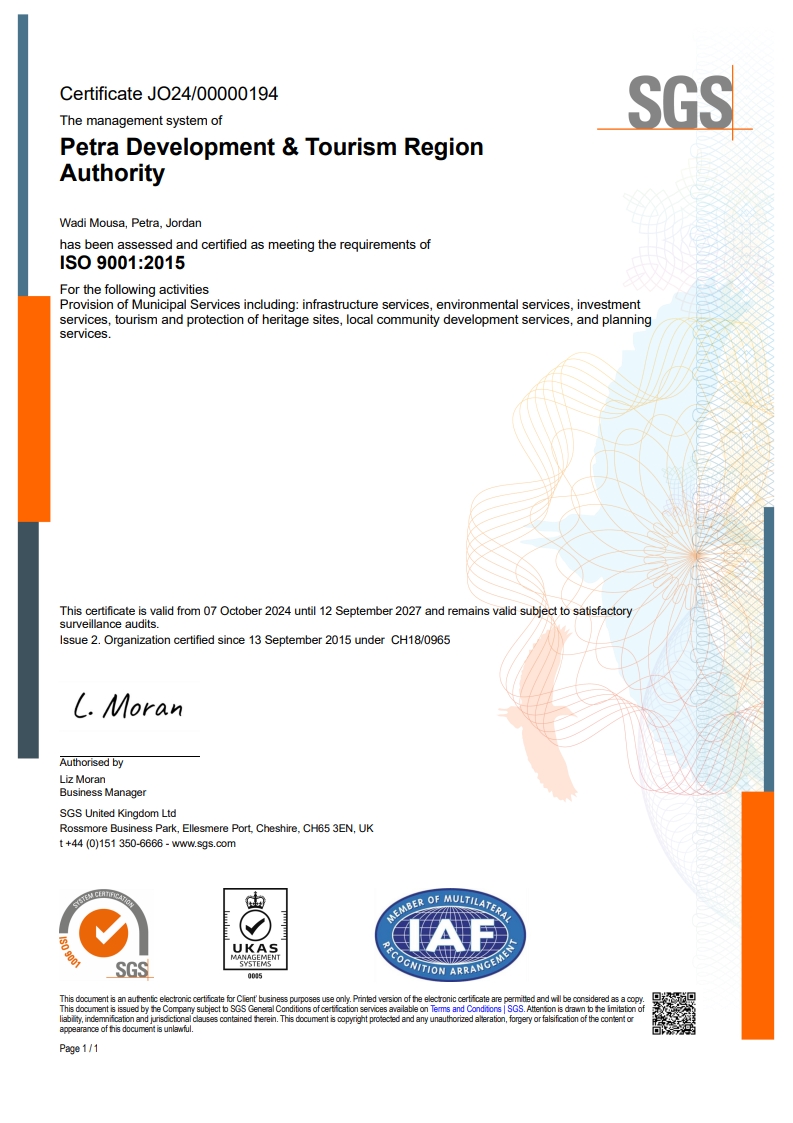 حافظت سلطة إقليم البترا التنموي السياحي على استمرار الاعتماد والتجديد لشهادة المطابقة للمواصفة الدولية لنظام إدارة الجودة (ISO 9001:2015) للسنة 11 على التوالي، وذلك بعد إجراء عملية تدقيق شاملة واستيفاء جميع متطلبات نظام إدارة الجودة وفقًا للمعايير الدولية المعتمدة.